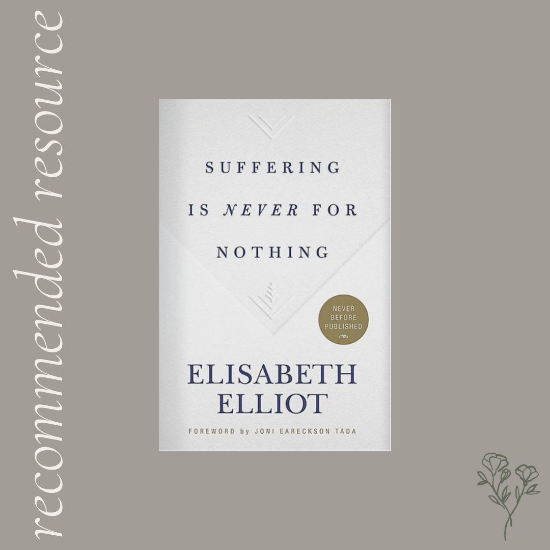 Our resource this week is Elisabeth Elliot’s Suffering Is Never For Nothing. This book is a transcript of a series of talks she gave in 1989. This series focuses on the nature and purpose of suffering and addresses the question “why doesn’t God do something about suffering?” Elisabeth Elliot walked through so many sorrowful days in her lifetime and is a wise and winsome voice on this topic.
